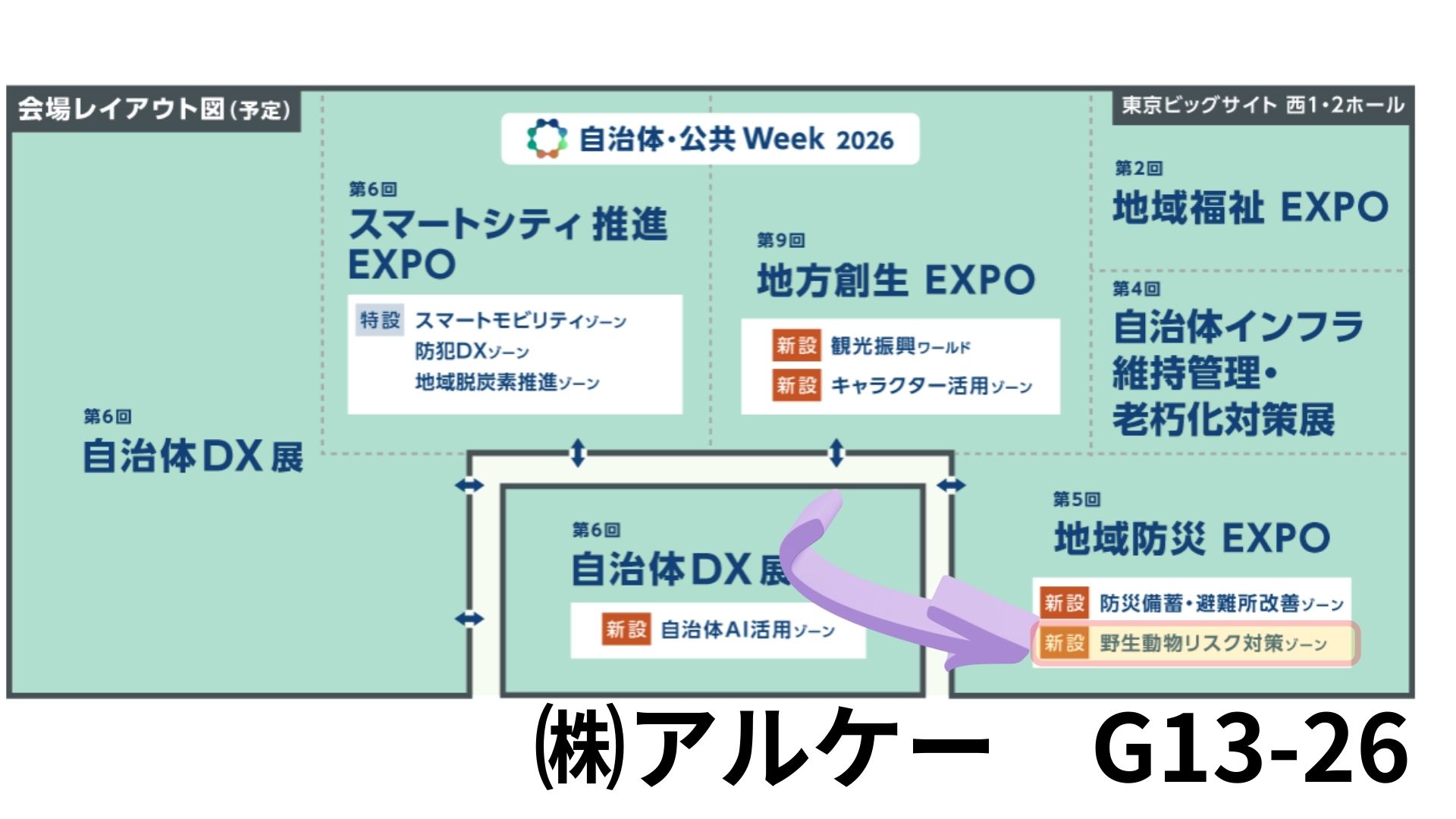 ブース番号は、G13-26 です。地図の右下あたりが今回新設された野生動物リスク対策ゾーンです。